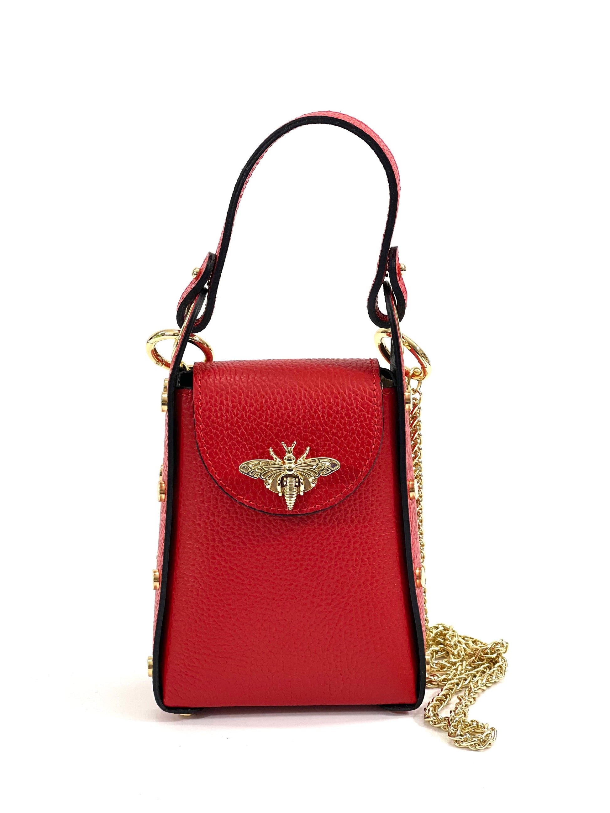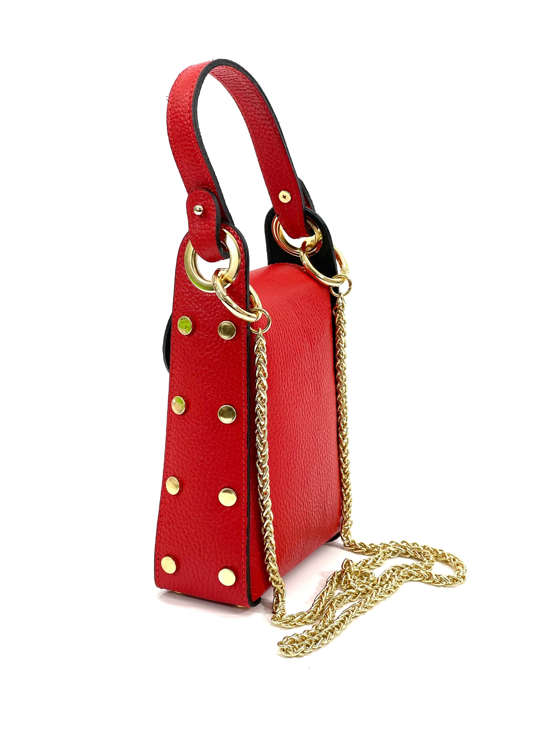 Geanta rosie din piele naturala este prevazuta cu maner din piele naturala si lant de umar auriu detasabil ( 115 cm).